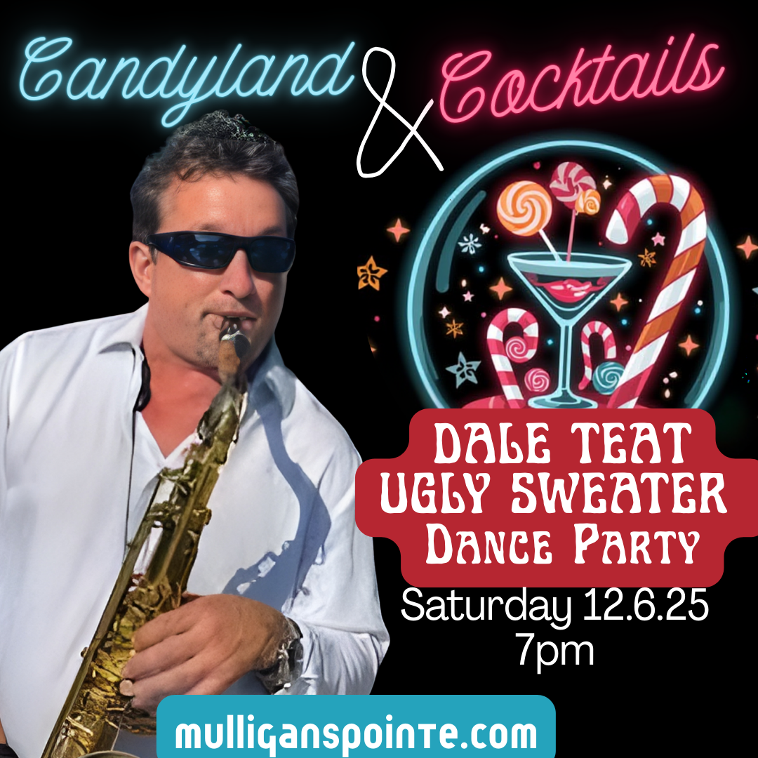 🎸 SATURDAY, DECEMBER 6, 2025 • 7 PM — Dale Teat The fun continues with Dale Teat returning to rock the house! Enjoy a great night of music, dancing, and festive cocktails surrounded by our magical Candyland Wonderland.