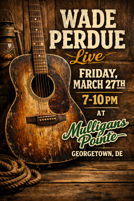 Join us at Mulligans Pointe this Friday, March 27th from 7PM–10PM for a great night of live music with Wade Perdue!